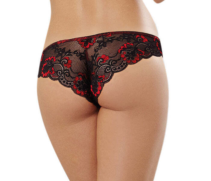 Microfiber cheeky panty with cross-dye lace back and satin bow trim.