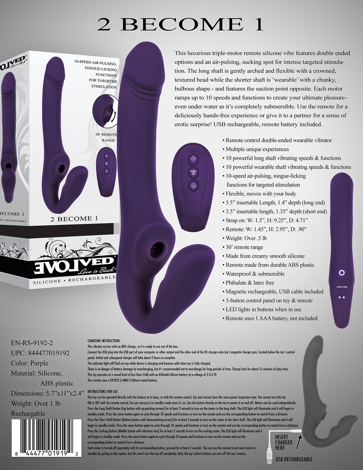 You're about to redefine what it means to double the fun with the 2 Beome 1 Strapless Strap On by Evolved Novelties. This isn't just any strap-on; it's a triple-motor, remote-controlled masterpiece designed for maximum pleasure. Picture this: a luxurious silicone vibe that offers double-ended options and an air-pulsing, sucking spot that hits the mark every time. Whether you're in control or handing over the remote for a cheeky surprise, this beauty promises an unforgettable experience. Dive in and let the water-resistant magic take you places you've only dreamed of.