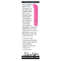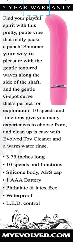 Find your playful spirit with this pretty, petite vibe that really packs a punch! Shimmer your way to pleasure with the gentle textured waves along the side of the shaft, and the gentle G-spot curve that's perfect for exploration! 10 speeds and functions give you many experiences to choose from, and clean up is easy with Evolved Toy Cleaner and a warm water rinse. - 9.5 cm (3.75 inches) long - 10 speeds and functions - Silicone body, ABS cap - Requires 1 AAA battery - Phthalate & latex free - Waterproof - L.E.D. control