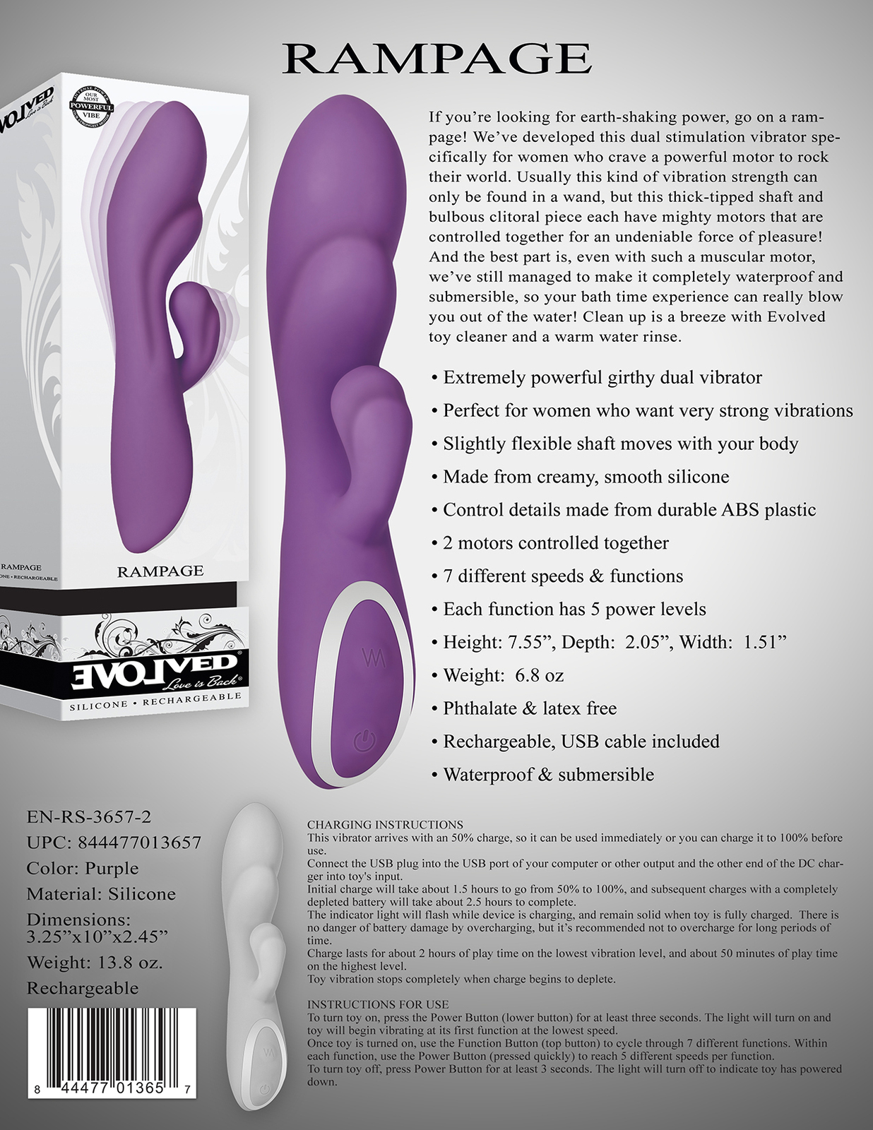 If you’re looking for earth shaking power, go on a rampage! We’ve developed this dual stimulation vibrator specifically for women who crave a powerful motor to rock their world. Usually this kind of vibration strength can only be found in a wand, but this thick tipped shaft and bulbous clitoral piece each have mighty motors that are controlled together for an undeniable force of pleasure! And the best part is, even with such a muscular motor, we’ve still managed to make it completely waterproof and submersible, so your bath time experience can really blow you out of the water! Clean up is a breeze with Evolved toy cleaner and a warm water rinse.