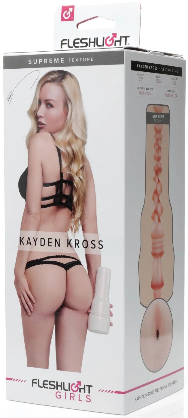 While there are many Fleshlight girls who each are featured in their own sex toy for unique, erotic pleasures, the sensual appeal of Kayden Kross is difficult to resist. Her flowing blonde hair tumbles over her voluptuous 32D chest, creating a peek-a-boo tease that can make it hard to concentrate on anything but the pleasures that her body holds for you. Her piercing blue eyes have a dominating yet inviting look that teases you into exploring all of her hidden areas. The confidence that she exudes tells you that she has the experience you crave from your partner. Kayden's tanned, perfectly shaped legs are held open for you, eagerly anticipating your intense presence. Her sex appeal brings the sophistication of Hollywood to life, and her voluptuously rounded butt, hips, and thighs lure you into her captivating presence. Kayden is the girl that you dream about, and your fantasies about the pleasures that she holds will come to life while you command your experience perfectly with your personalized Fleshlight sex toy.