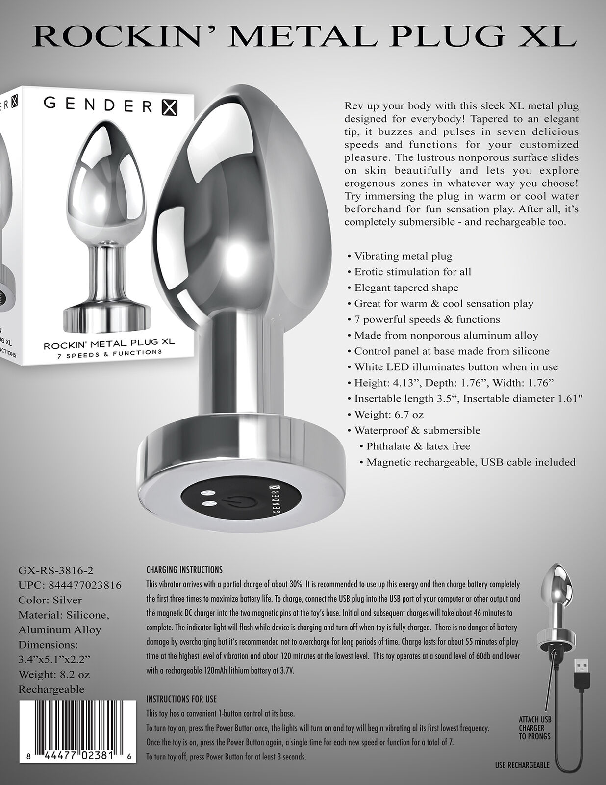 Unleash your inner adventurer with a metallic marvel that takes your pleasure game up a notch. The 4" Vibrating Metal Butt Plug from Gender X isn’t just any plug – it’s your ticket to a whole new level of excitement. With its sleek, nonporous aluminum alloy build, this bad boy slides in effortlessly, offering a tailored experience with seven electrifying vibration settings. Whether you're flying solo or adding some zing to partnered play, this plug is all about bold sensations. Fancy a bit of temperature play? Go ahead and dunk it in warm or cool water for that extra thrill. And with its rechargeable design, it’s always ready for the next round.