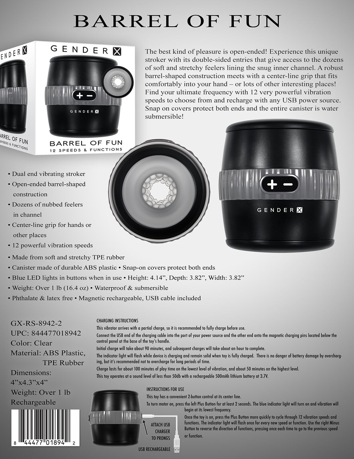 Unleash a barrel of pleasure with a stroker that packs a punch! The Barrel Of Fun Vibrating Stroker by Gender X is your ticket to a wild ride, offering dual entry points that lead to a sensation-packed channel lined with dozens of tantalizing feelers. It's not just a tool, it's an experience — with 12 intense vibration speeds to explore, you'll be driving yourself to new peaks. This robust, barrel-shaped wonder fits perfectly in your hand, but why stop there? Take it for a spin in the shower, or wherever you fancy, and let the waterproof design open up a world of possibilities.