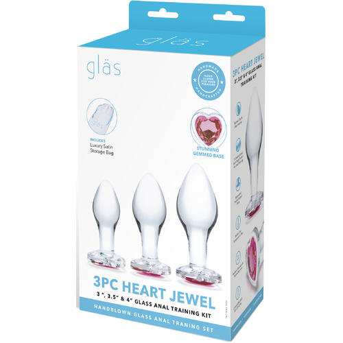 Glass toys are the unsung heroes of the pleasure world. Their smooth, firm surface offers an experience that's both safe and luxurious. Ideal for temperature play, they can be warmed or cooled to suit your mood and desires. Perfect for those looking to explore anal play, this 3Pc Heart Jewel Glass Anal Training Kit is designed to elevate your game, whether you're a solo adventurer or enjoying it with a partner. It's not just about the thrill — it's about doing it with finesse and style.