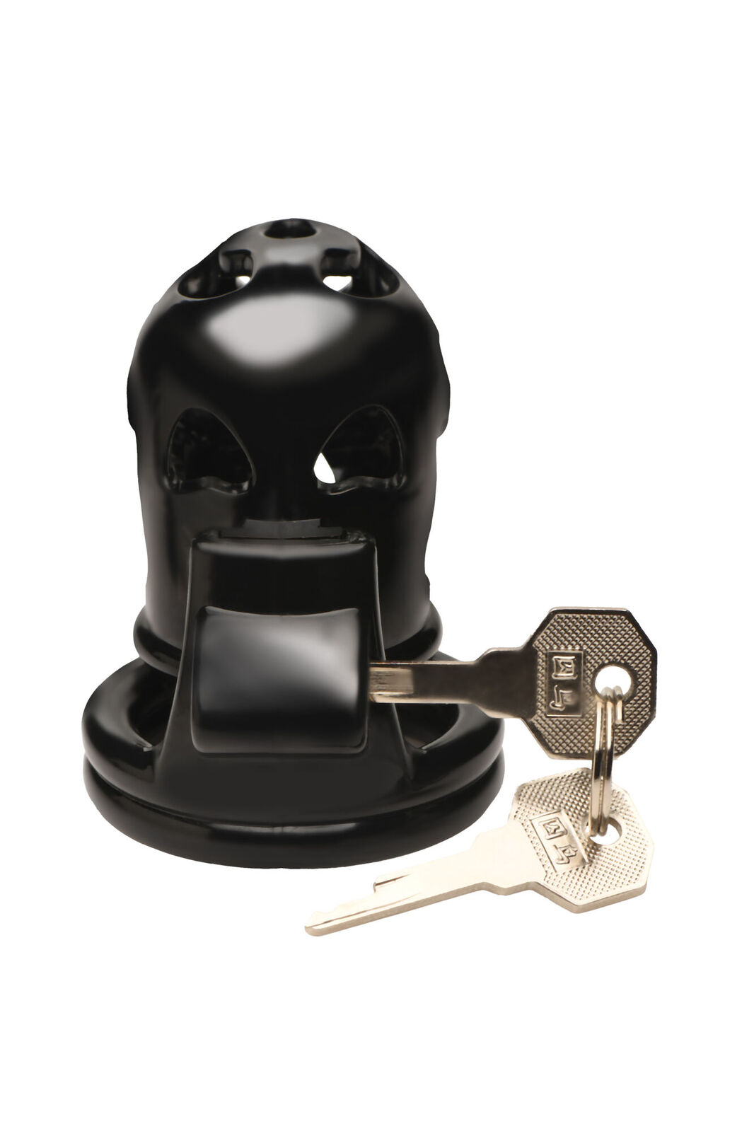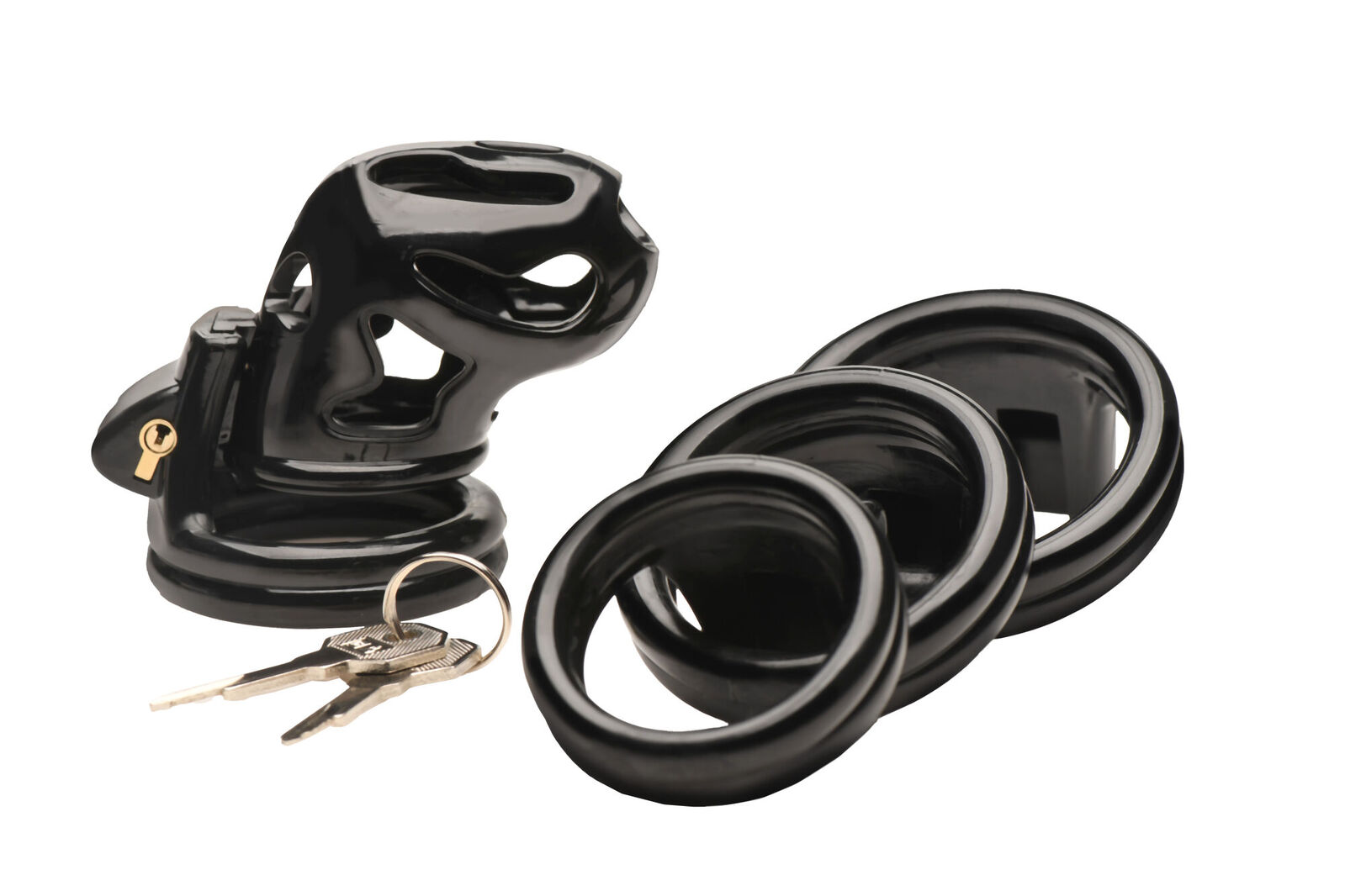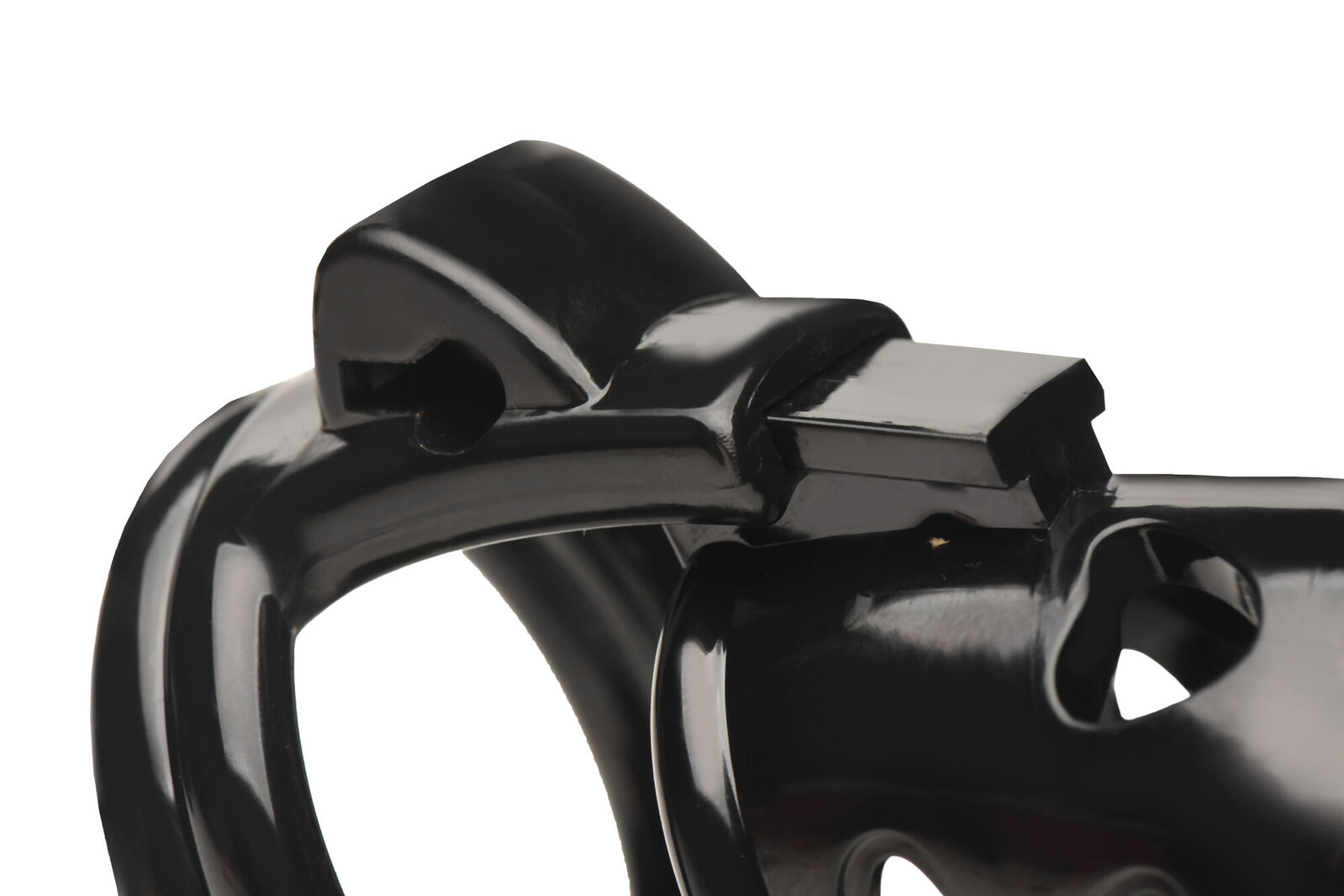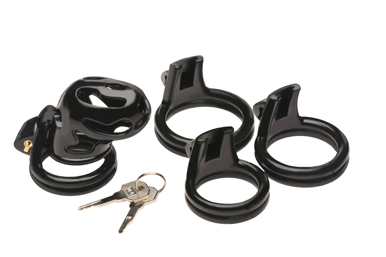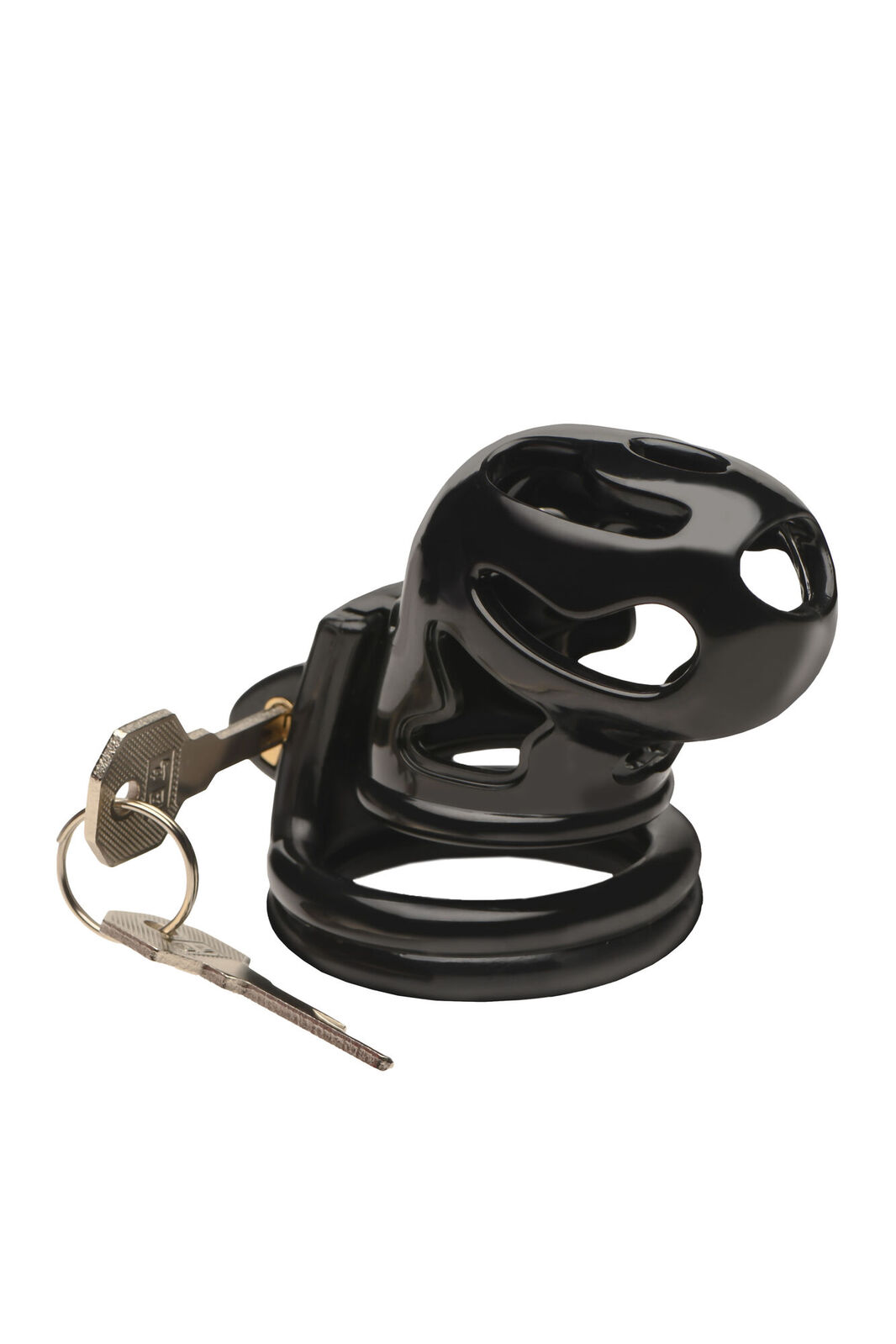 Locking into a new level of pleasure is just a snap away with the Hard Stop Double Ring Chastity Cage from Master Series. Crafted from sturdy black plastic, this starter cage is your ticket to the world of pleasurable restraint. It features an intuitive locking mechanism, so you know your crown jewels are secure and snug behind these walls. With a couple of keys for added peace of mind, you can focus on the experience. And let's not forget the four adjustable rings to make sure every chap finds comfort in confinement. Plenty of vents ensure airflow and comfort, making those long-term decisions feel just as appealing. Best of all, the design includes a tip hole for easy cleanup, so you're not caught out when nature calls.