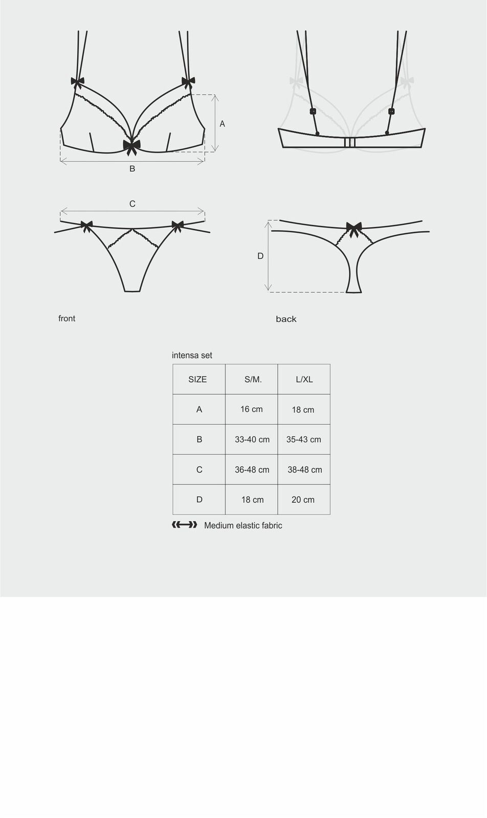 You can be 100% sure about that. Intensa set will make this night special. Tempting bra adds you plenty of sex appeal. Mixed with double thong it is a perfect set for you! Lacey cups beautifully emphasizes your breast. Double straps crossed on the back are filrtatious and seduce.