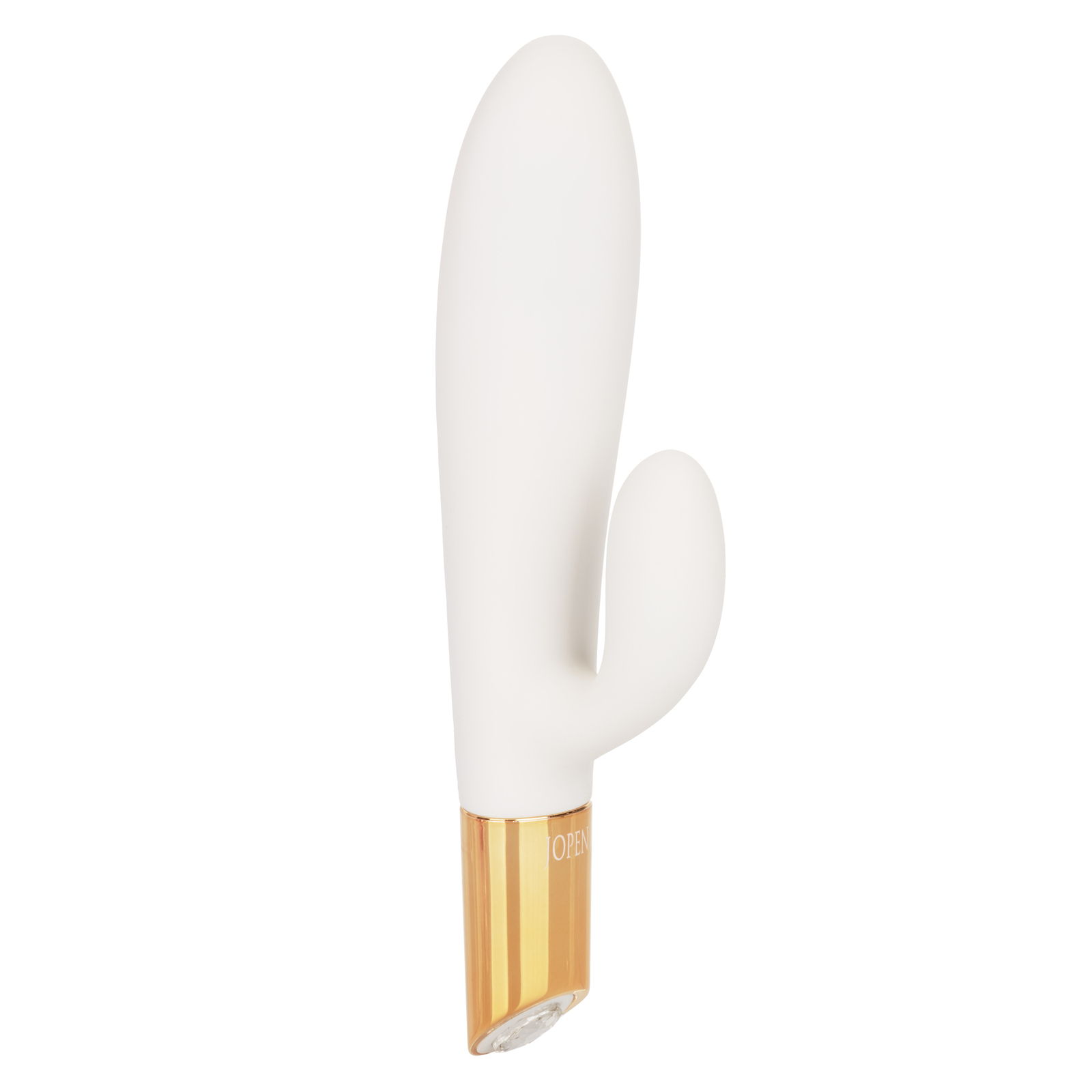 The Callie™ by Jopen Vibrating Dual Massager is silky and smooth and virtually seamless. This beautiful massager brings you two ways to achieve the ultimate satisfaction. For intimate pleasure, this fabulous vibrator offers a peak experience. Shaped from our high-quality Satin Finish™ Silicone, the dual massager provides 7 fantastic functions of intense vibration, pulsation, and escalation, with 5 independent speeds for each function. Sleek and stunning designer accents are a part of any Callie by Jopen intimate vibrators for women, and are beautifully realized here. This product features simply gorgeous gemstone easy push button operation. Just hold for 3 seconds to turn off once you’ve been thoroughly turned on. And, this luxurious massager is USB rechargeable, too, and comes with its own charging cord. A complete charge takes only 2 hours. You’ll love the seductive, sophisticated white with gold accent design. And, Callie’s pure silicone is completely safe and fully satisfying. This gorgeous rabbit style vibrator is also 100% waterproof and comes with a one year warranty. For the peak in pleasure, Jopen offers a full line of intimate products, each one designed to create a superior, stimulating, and exciting experience that fulfills every desire. Passionate excitement and high-quality control and performance blend to make Jopen a leader in luxury products. Ready to provide peak passionate pleasures, this doubly stimulating vibrator will lead you on rewardingly intimate paths. Get ready for the ultimate bedroom adventures and the bliss of total gratification with Callie™.