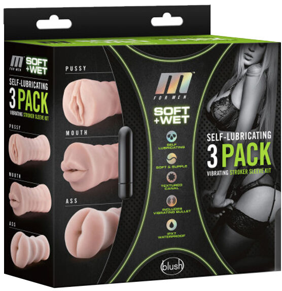 Prepare to elevate your solo sessions to legendary status with a kit that doesn't just meet expectations — it surpasses them. The Self Lubricating Stroker Triple Pack from M for Men is your all-access pass to a bespoke pleasure experience. With three distinct sleeves emulating oral, vaginal, and anal thrills, plus a vibrating bullet for that extra kick, this set is your ticket to variety and satisfaction. Crafted from lifelike X5 material, these strokers offer a touch so authentic, you'll be doing a double-take. Whether you're a seasoned pro or just beginning your journey, this pack is your new best mate in pleasure.