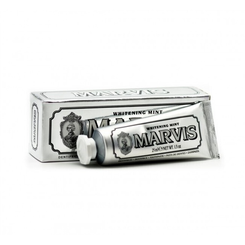 A travel sized toothpaste in Marvis's Whitening mint flavour.