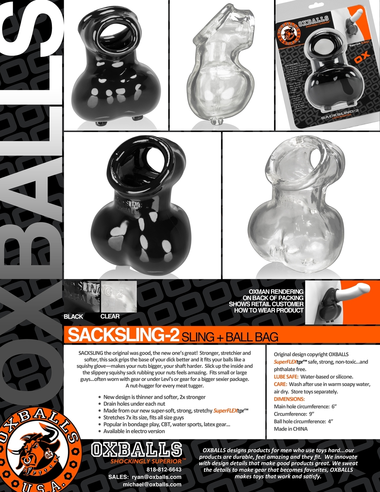 Just like the original, SACKSLING-2 has a built-in COCKSLING morphed onto a slick, stretchy sack for your balls...guaranteed your nuts have never experienced anything like this.