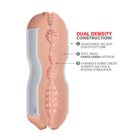 Get a TIGHT grip on your next stroking session with this incredible dual-density stroker! Experience the tightest, softest, most realistic masturbator on the market with the Tight Grip Dual-Density Squeezable Stroker. Made from our ultra-lifelike Fanta Flesh on the inside and our specially formulated Tight Grip TPR on the outside, this super soft stroking sleeve features a firm outer construction that allows you to get a tight grip and perfect squeeze every time. The ergonomic shape feels great in your hands and won’t get slippery or sticky, allowing you to get a perfect stroke even when your hands are lubed up! Mind-blowing textures! Slide into the super-soft Fanta Flesh and enjoy intense stimulation, lifelike sensations, and explosive climaxes. The tunnel of the realistic sleeve is lined with canals, ribs, and tiny love nodules that tease and surround your cock with each stroke. The super-soft Fanta Flesh is velvety smooth on the inside, wraps around you like a second skin, and warms to your body heat.