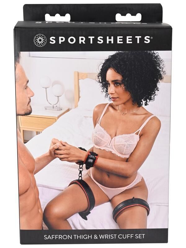 Lock your lover in position and let the fun begin with the Saffron Thigh And Wrist Cuff Set. This isn't just any restraint gear — it's your ticket to a world of pleasure possibilities. Made by the clever folks at Sportsheets, this set lets you play around with positions until you find just the right one to spice up your bedroom antics. From wrists to thighs, to a cheeky hogtie, you're in control of the adventure.