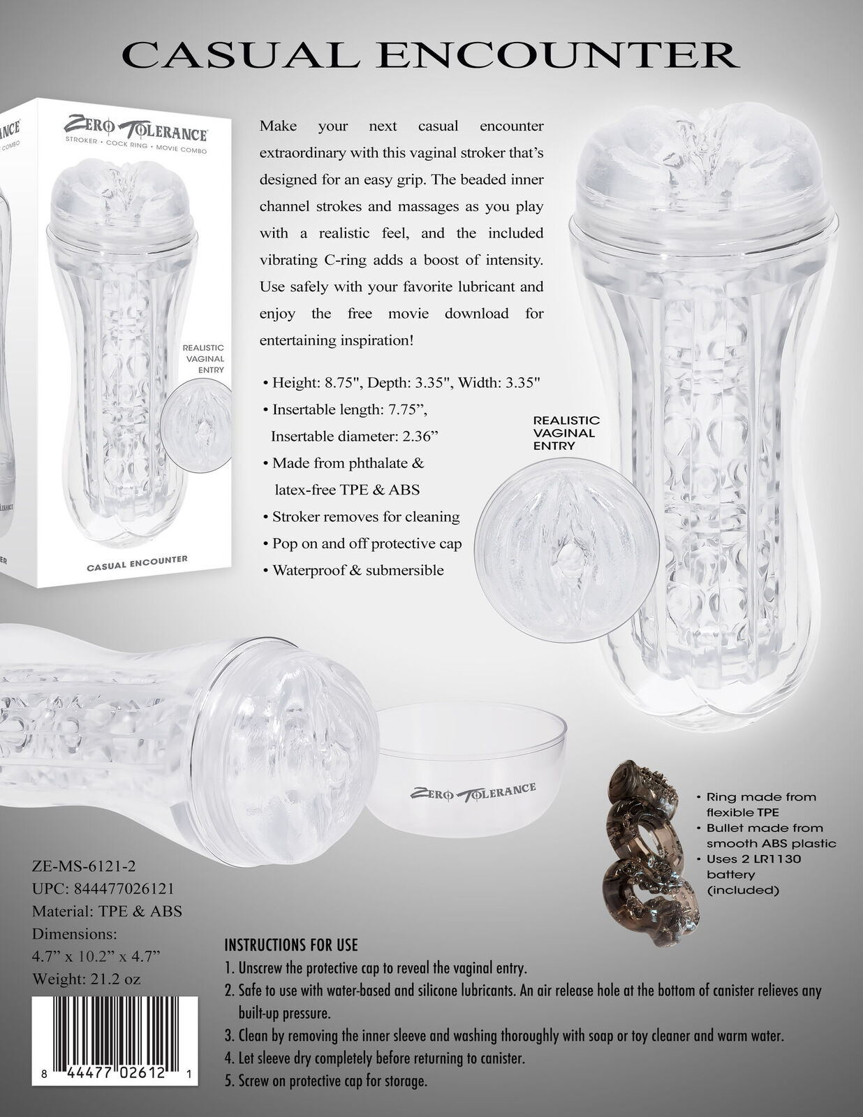 Strokers are more than just toys — they’re your personal trainers for better stamina, control, and all-around satisfying sessions. The Zero Tolerance CASUAL ENCOUNTER Clear Vagina Stroker is designed for those who want more than basic; it’s the perfect blend of realistic play and thrilling capability. Whether you're pumping it solo or tweaking it up for couple’s play, this stroker is your ticket to a more rewarding experience.